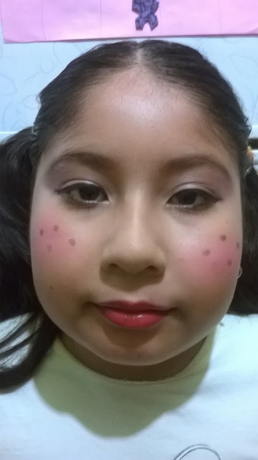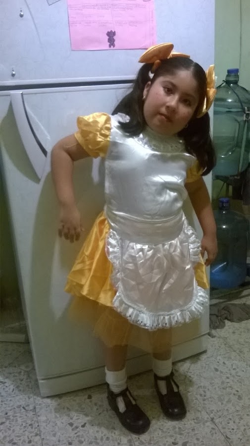 mi pequeña que no le gusta nada de terror quiso ir de muñeca, aprovechamos un traje que uso para un evento escolar, solo agregamos peinado y maquillaje
