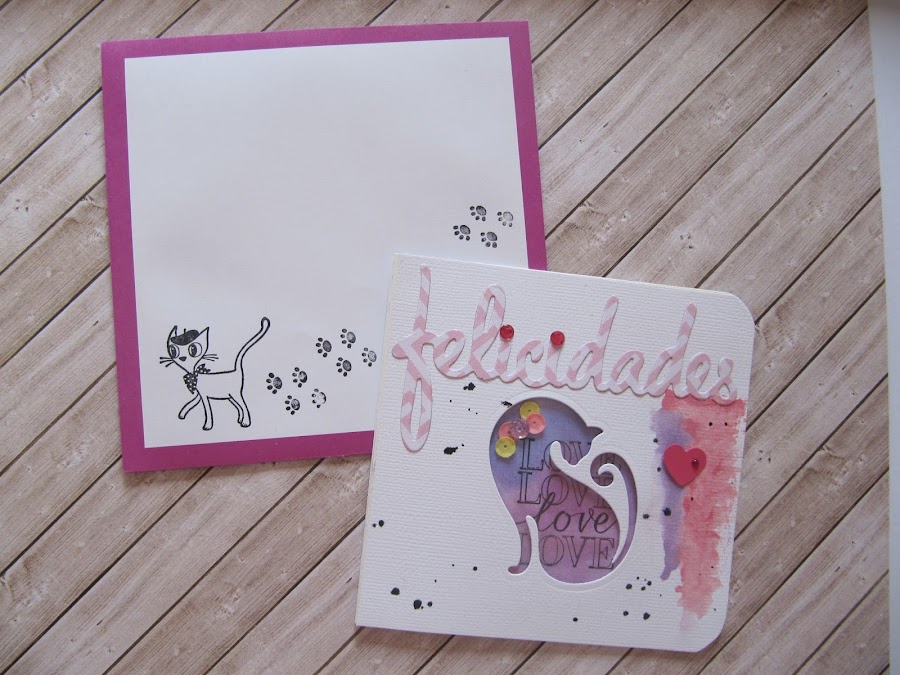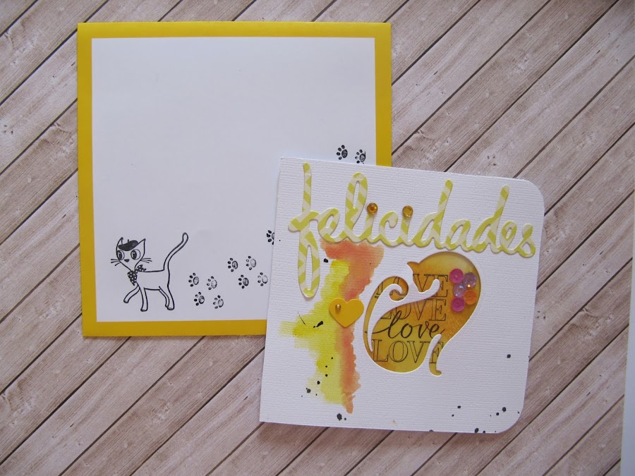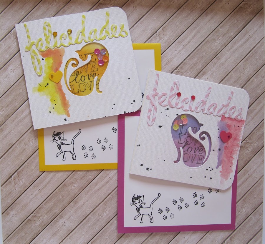 Mi entrada es de dos tarjetas, porque hoy es su cumple, ellas son gemelas y he hecho dos tarjetas más o menos iguales, ya sabéis que nunca salen igual, con sus colores preferidos una amarilla con naranjas, la otra en tonos rosa y lilas. Con sus sobres respectivos que los decore con un par de sellos, y como no?, tema gatuno!!