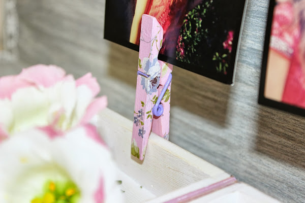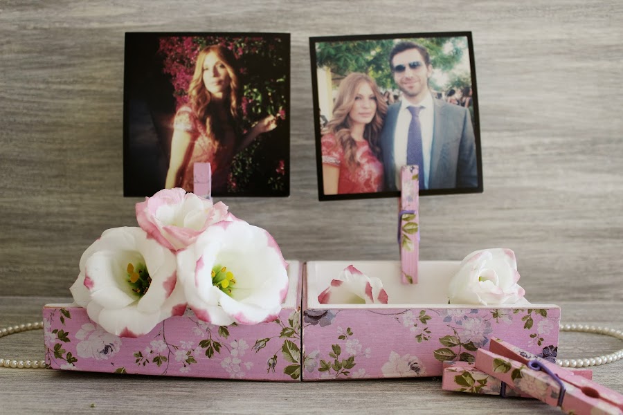 Quitamos los tornillos que sujetan la parte de abajo de la cajita para poder abrirla a tope; la tumbamos hacia arriba y colocamos las pinzas sujetas a la caja con unas bonitas fotos. Dentro de la caja ahora podemos poner lo que se nos antoje, flores, provisionalmente collares, anillos, etc.