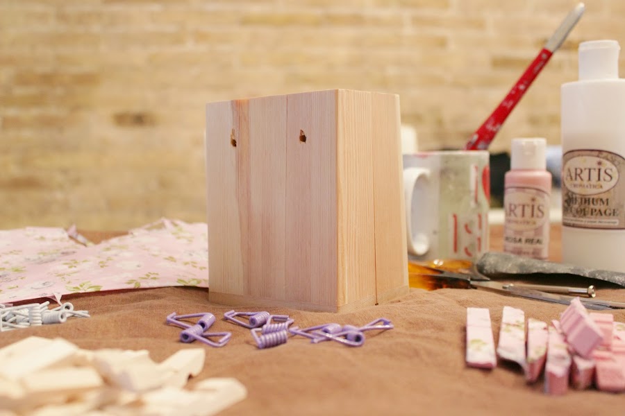 La idea me surgió de querer dar vida a cosas que, por decirlo de alguna manera, carecen de alma, aparentemente por su aspecto vasto. Para realizar este experimento elegí la cajita que vemos a continuación y unas cuantas pinzas. Mi reto no sólo fue darles vida a la cajita y a las pinzas sino también averiguar de cuantas maneras las podía utilizar.