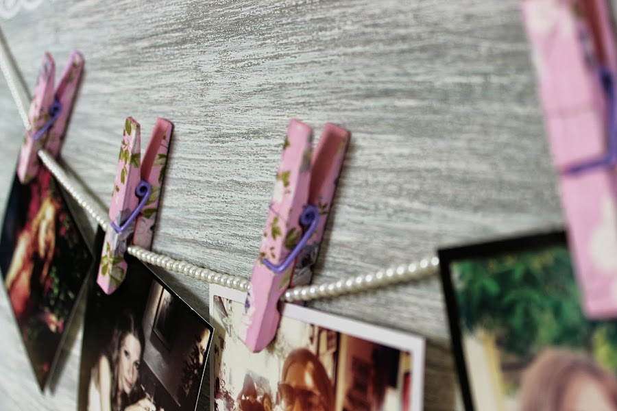 Ponemos un collar de perlas a modo de cuerda y colgamos las fotos sujetadas por las pinzas.