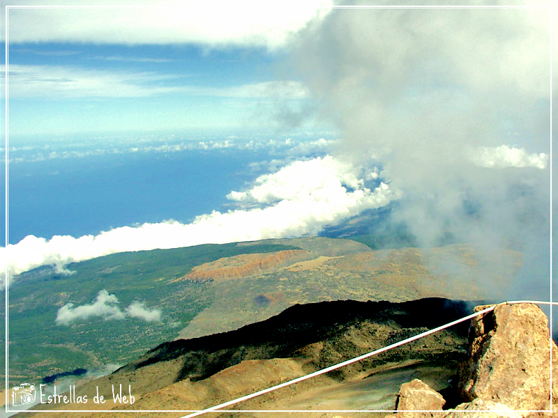 Esta fotografía la realice desde la cima, del Teide sobresaliendo por encima de las nubes con una cuerda de protección hacia el vacío y en la que se pueden apreciar las "fumarolas" que emite el cráter con un intenso olor a azufre.