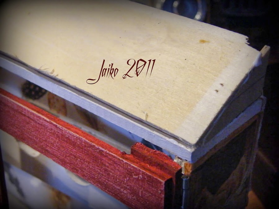 Al principio pensé en poner arriba unas letras de goma eva.. pero otra idea de U.H. fue hacer un tejado, como? con los listones de samba, tengo de varias anchuras así que corte varias piezas de cada y las uní en un soporte con forma de cuña que he colocado en la parte superior, pero mejor lo veis.