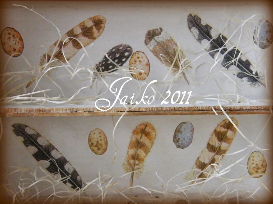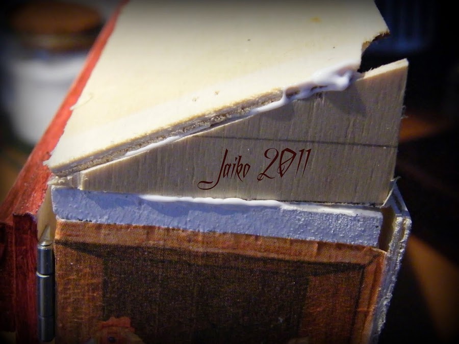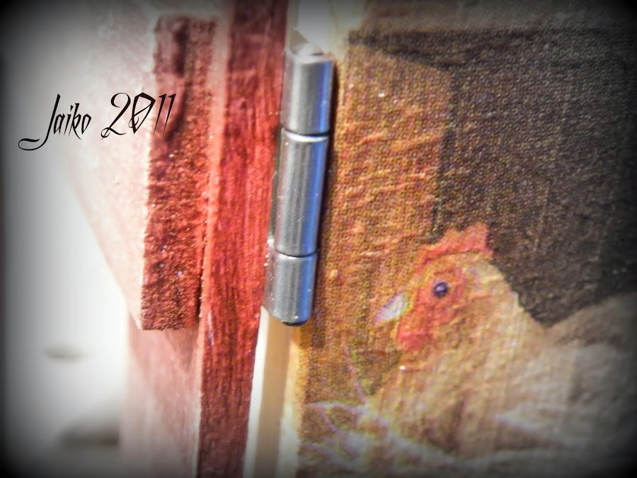 Ahora es hora de la decoración de la parte frontal, esto lo he tenido medio claro desde que se me ocurrió la Jaikada, siluetas de un gallo y su señora gallina con un papel bonito... el que yo tenia intención , por cuestiones inexplicables no lo he encontrado, lo guardé tan, tan bien en su día que a saber donde lo he metido, en el ala norte de la mansión supongo... en fin, pues pasamos al plan b, que no me ha disgustado, papel con un fondo de escritura y envejecido con patina en los bordes.