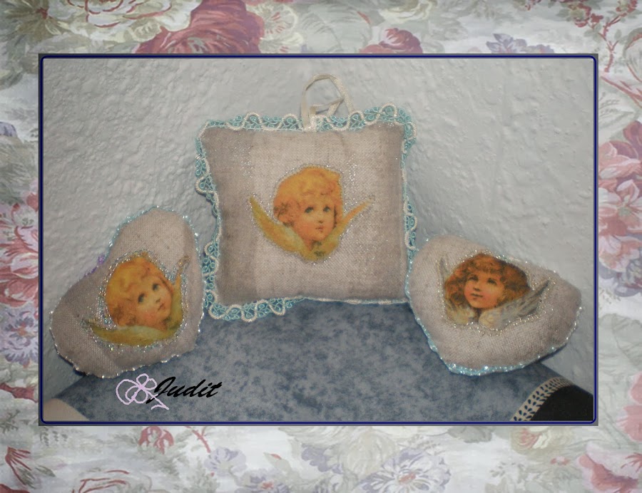 Estos angelitos, hechos de la misma forma, son para colgar y llevan dentro unas hierbas de olor.