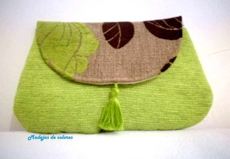 Esta otra en verde lima con tapa en tonos tierra y flor también verde, como borlón.