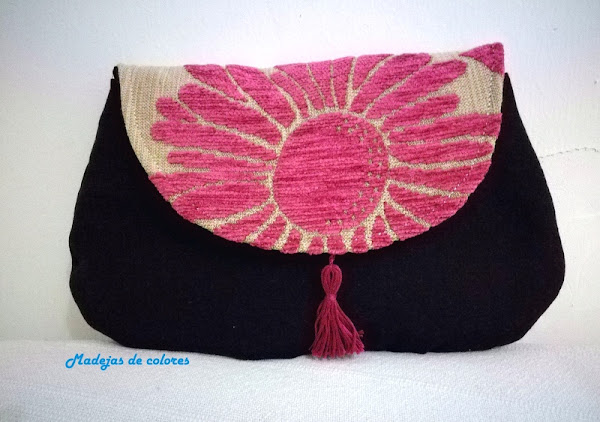 Esta elegante cartera negra, con flor morada y borlón, es igual a otra que hice con flor negra.