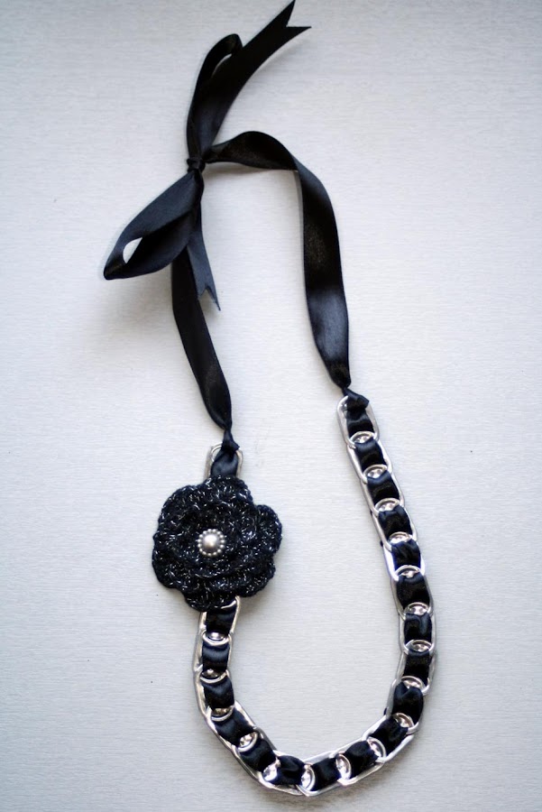 Hoy traigo un nuevo collar realizado con anillas de latas que me han encargado. Este lo querían con el lazo en color rojo y con un broche-flor a juego. Pues este ha sido el resultado: COLLAR COLGADO DETALLE DE BROCHE-FLOR Espero que os haya gustado.Besos y hasta la próxima entrada.