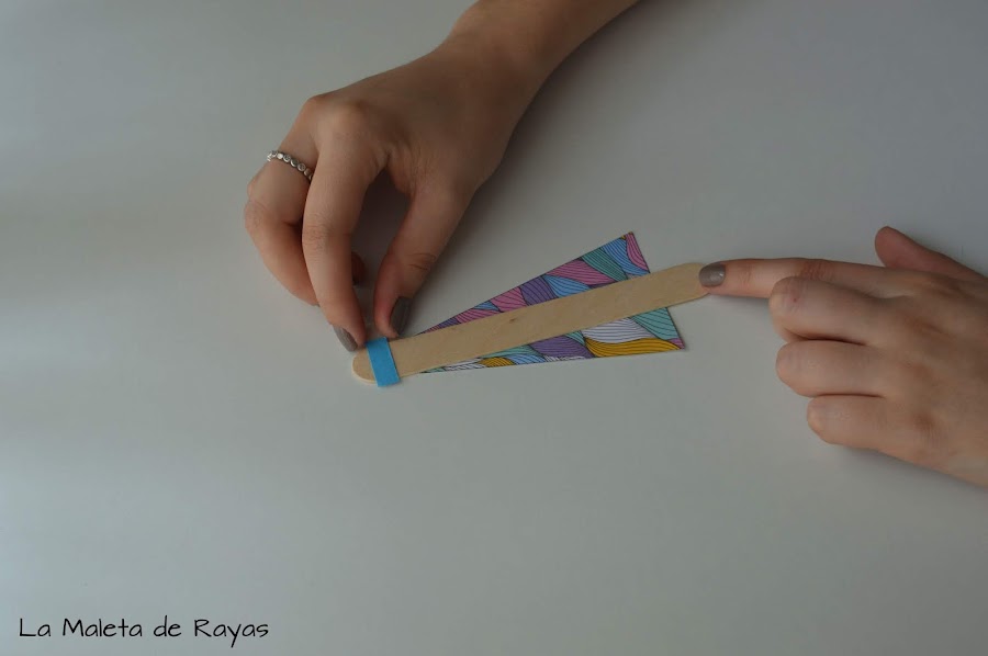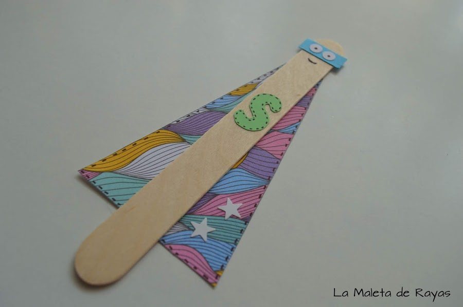 En papel decorado (que podéis sustituir por papel de regalo o lo que se os ocurra) he recortado la capa de este enmascarado. En cartulina azul he recortado un rectángulo para hacer la máscara. Ambas cosas las he pegado al depresor con pegamento en barra.