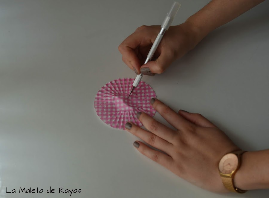 Empezamos cogiendo una cápsula para hacer magdalenas y la doblamos a la mitad. En el centro, hacemos una incisión para meter el depresor.