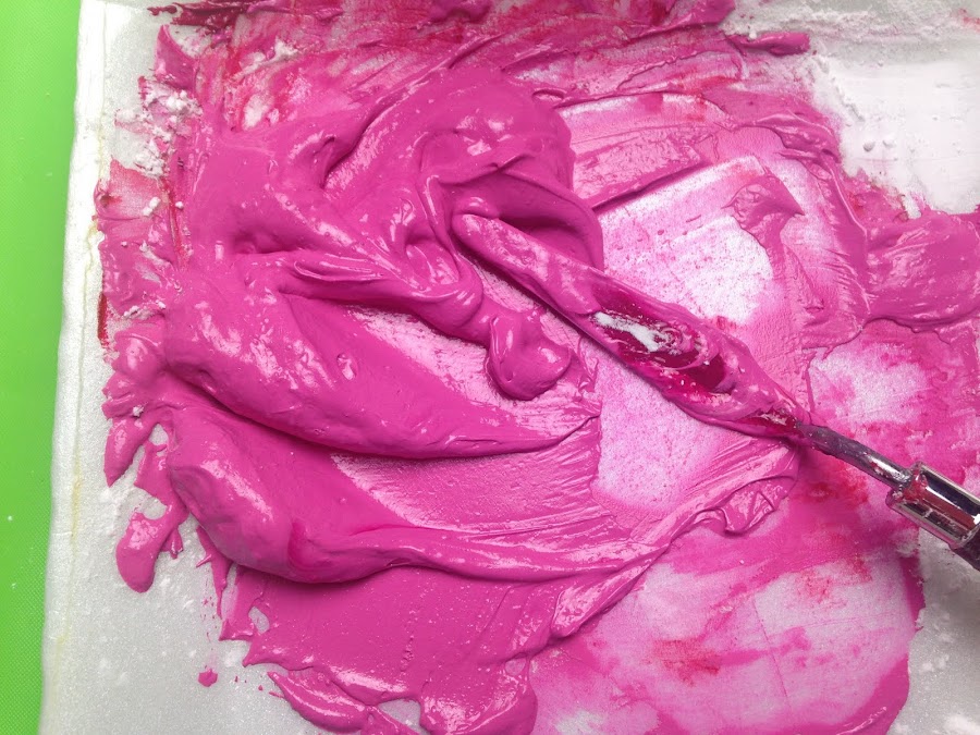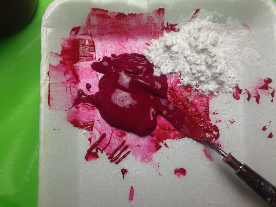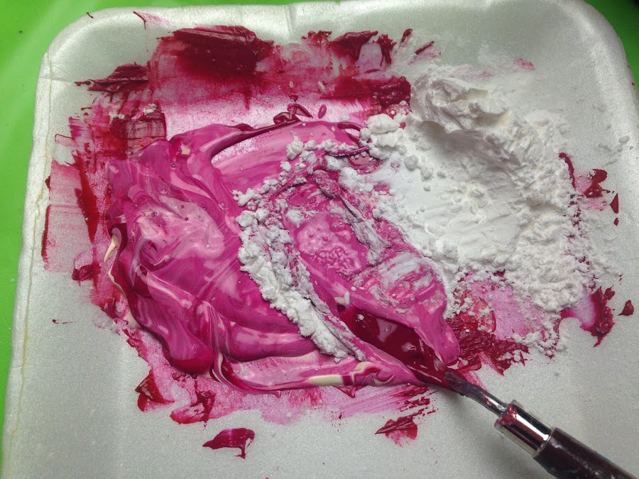 Colocar la pintura acrílica que se necesita espesar en una bandeja descartable y agregarle la fécula de maíz e ir incorporándola de a poco sin miedo a que se formen grumos.