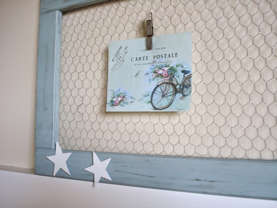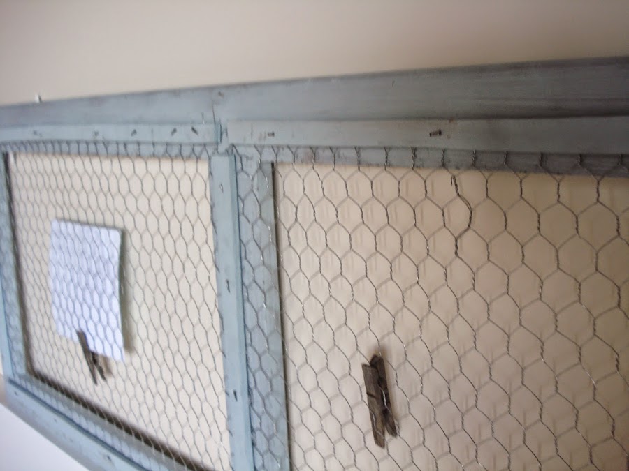 La puerta tenía un cristal pero decidí colocar malla gallinera. Corté unas tiras de madera para sujetarla bien y rematar la malla y que no pinche. Las pinté del mismo color que la puerta.
