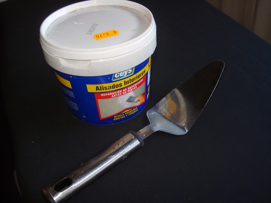 Ya sabéis que hago los relieves con pasta niveladora que se usa para reparar cuando se pinta, cuando termine seguro que compraré la pasta para hacer relieves, pero por ahora a gastar esta. La extiendo con una paleta de tartas, me compré una barata en los chinos y va de maravilla es ancha y extiende muy bien la pasta.
