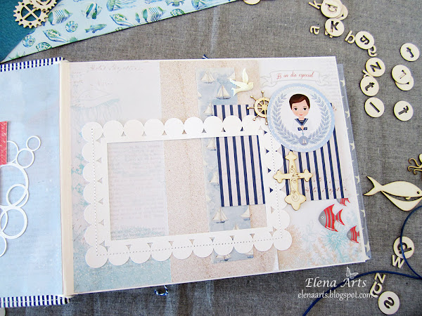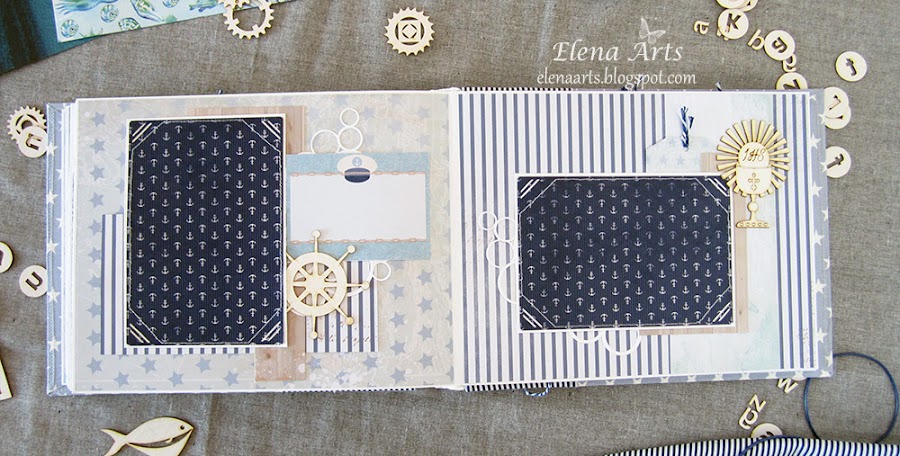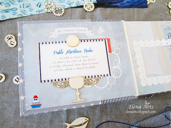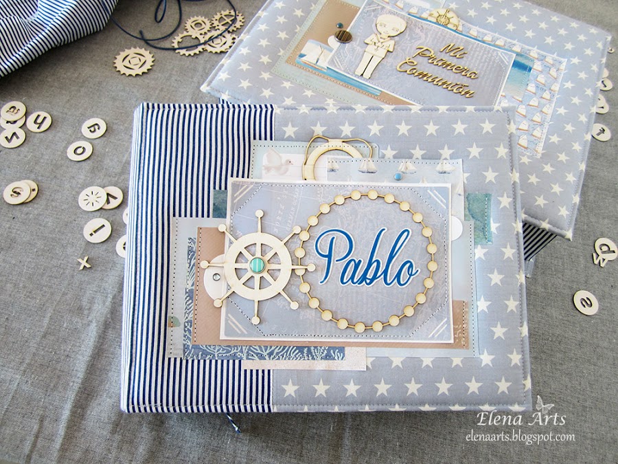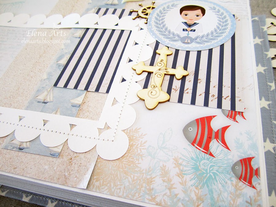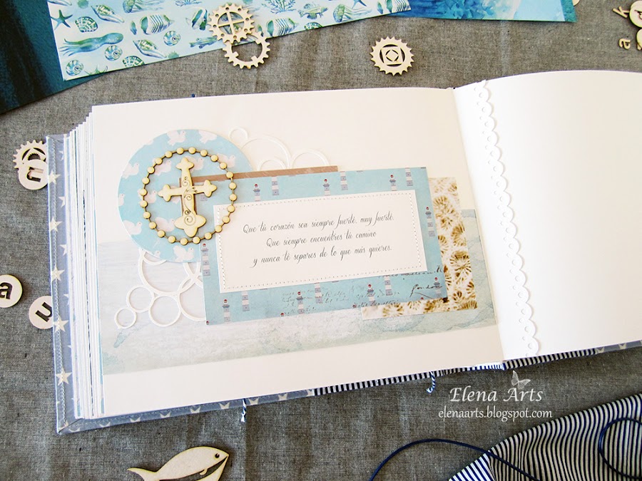 El timón, el marquito redondo y otros chipbords son de Kora Projects y hacen un papel imprescindible en la decoración de todo este trabajo. Los papeles que he utilizado en este proyecto, son de diferentes fabricantes, incluidos los de Kora projects, como esta colección para Primera Comunión con motivos marineros.