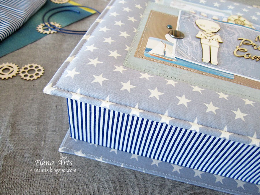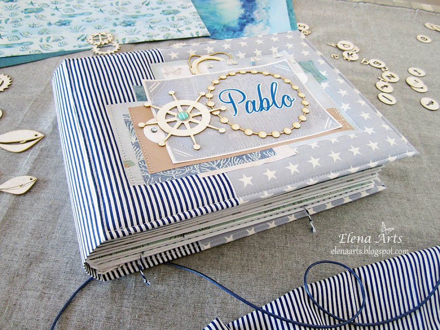 He combinado las dos telas de algodón para forrar las tapas del álbum y de la caja. Todo está cosido a máquina y bien bien bien pegado, que le tienen que servir de recuerdo toda la vida a Pablo.
