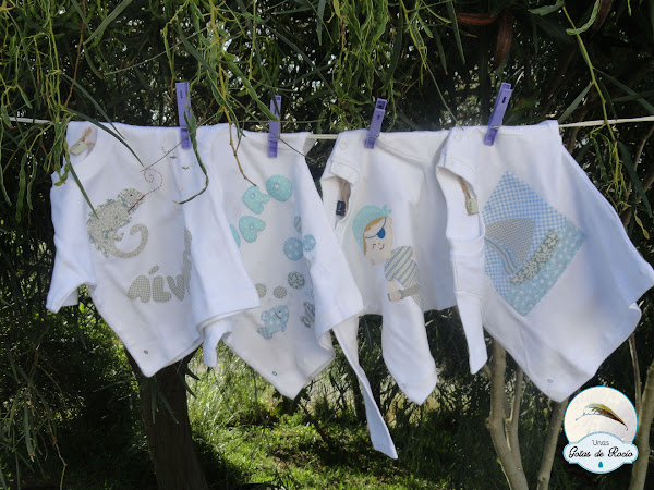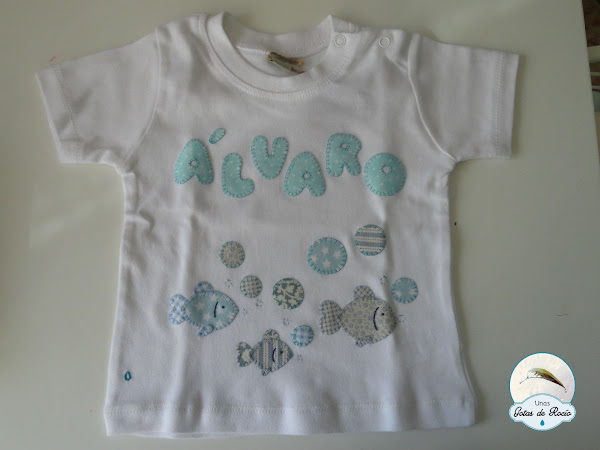 La mamá de Álvaro compró camisetas, telas, fliselina doble cara, pensó ideas, recortó telas... y no buscó ningún tutorial. De ahí que después de su intento me pasara todos los materiales y me dijera: "qué atrevida soy, por favor, hazlo tú". Le apetecían temas marineros, que el nombre del niño apareciera si no en todas, sí en algunas camisetas, que alguna llevara un camaleón (porque le recuerda a la playa de Urbasur) y creo que poco más.