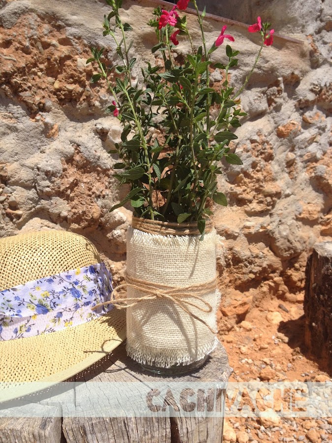 Corte la tela, enrolle un poco de cuerda en la boca del tarro, pegué la tela con un puntito de silicona y le anudé un lazo alrededor, bien sencillo!!!