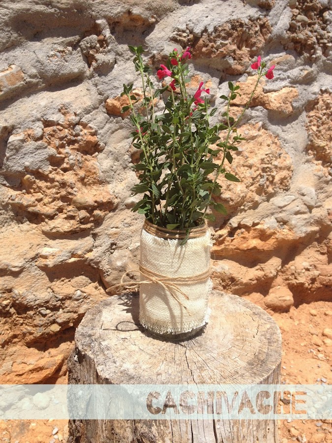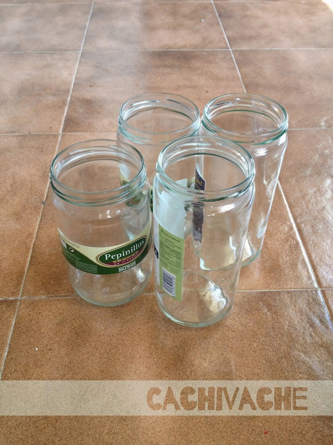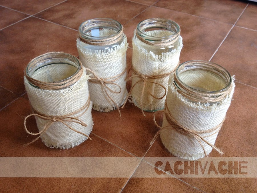 Aquí están los tarros sin decorar, solo necesité tela de arpillera, cuerda de sisal y silicona para transformalos.