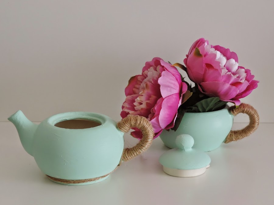 Pinté la tetera por partes , dos capas dejando secar entre cada una de ellas , pasé una capa de cera por cada una de ellas ( quizá más adelante las barnice) y cuerda alrededor de cada asa y el resultado final me ha encantado, facil no? pues animaos con esas cositas que teneis aparcadas en casa porque dán mucho juego solo con un poco de pintura y un poco de cuerda....