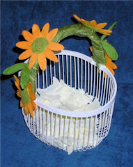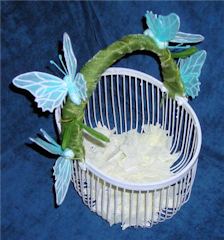 Tul en verde enrrollado, para hacer de esas dos asas, una sola. Vamos colocando flores y mariposas, dejando la parte en la que vamos a coger la cesta, solo con tul.