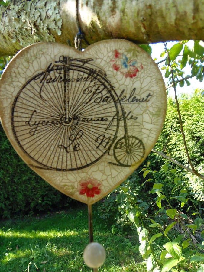 Antes de irme estuve de santo y Puri me envió esta perchita corazón,con craquelado,decoupage,transfer...preciosa..a qué sí?