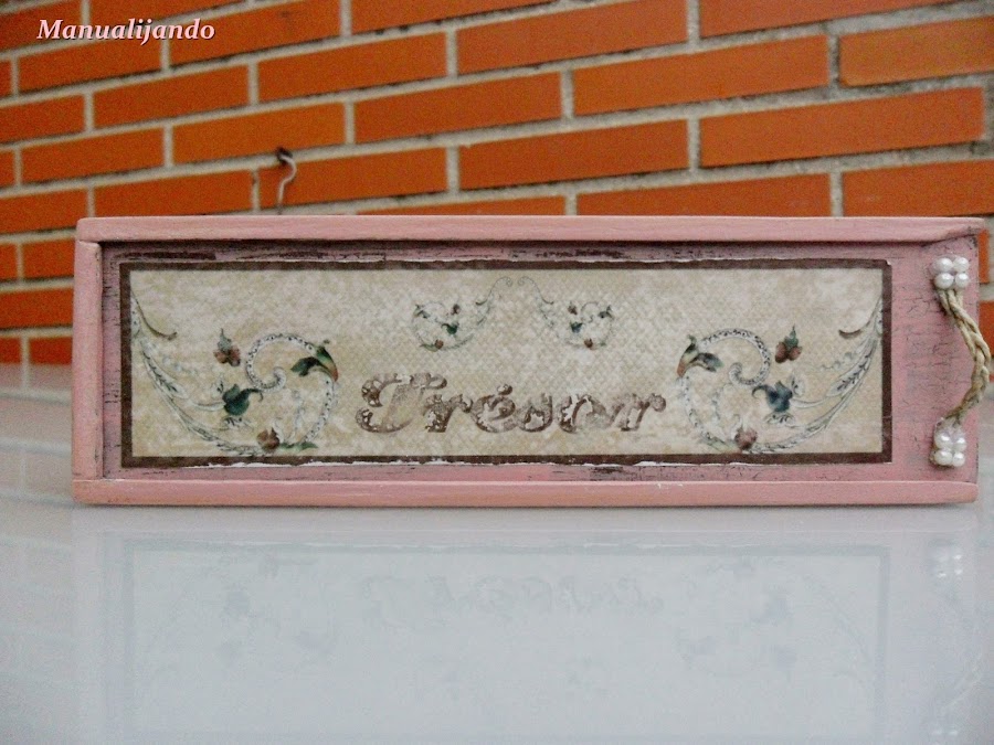 De hecho, no sé si lo vereis en la tapa, donde le he puesto el improvisado tirador, todavía se puede ver craquelado, lo dejé porque no me pareció mal, pero el resto de la tapa nanai, así que le puse decoupage y el resto de la caja lo lijé levemente para que saliera un poco el marrón, porque después del fiasco de la tapa ya no me atreví a seguir.
