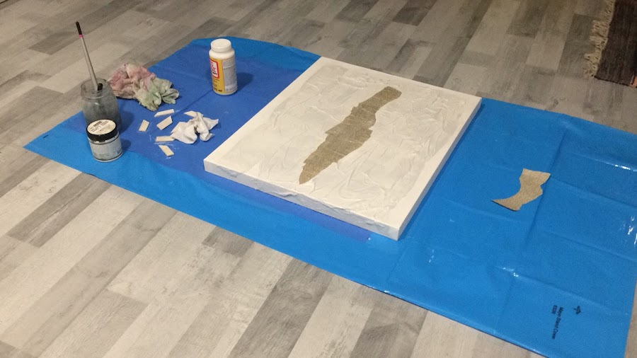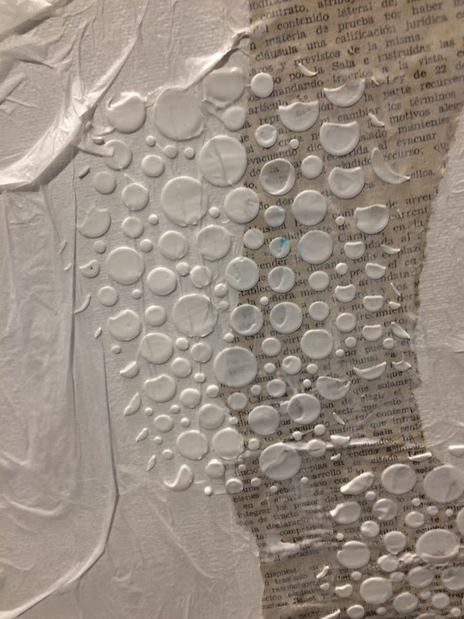 He dado un base de gesso a mi canvas y una vez seco he puesto un papel de seda blanco y papel de libro antiguo