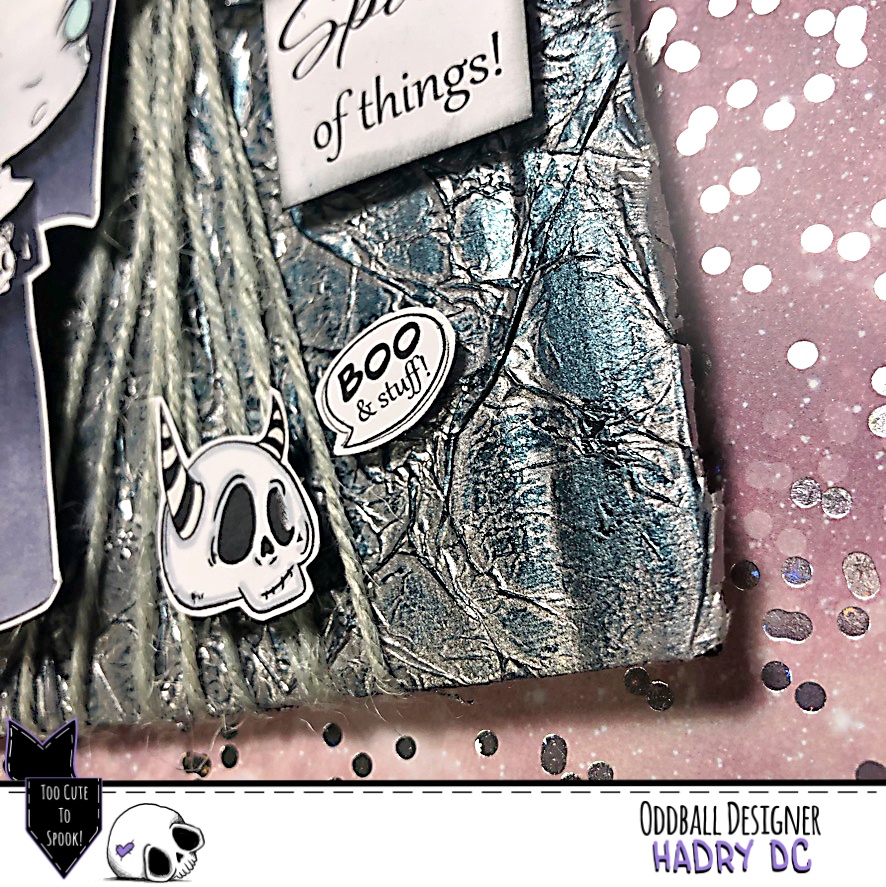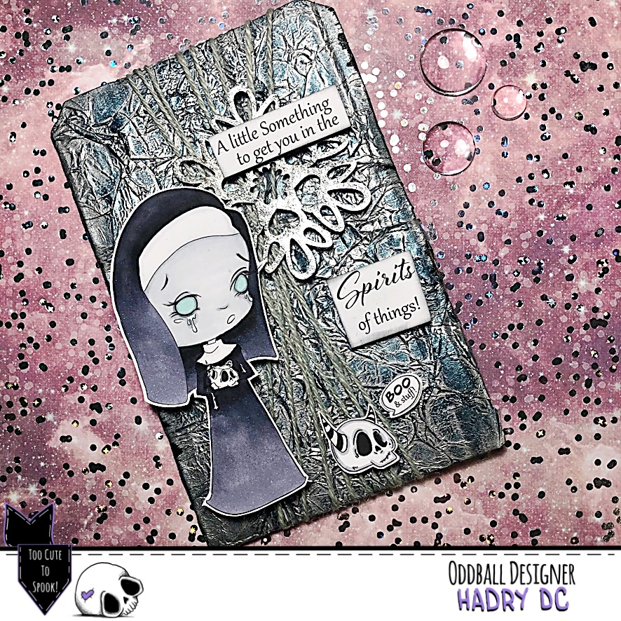 He creado un tag con un fondo mixed media, base de gesso negro, papel de seda plateado que he arrugado y lo he pegado sobre mi tag, Finger Wax Dora color "Petroleum" una cuerda, y el chipboard esta pintado con Sparks color "Raven Black" y Wax.