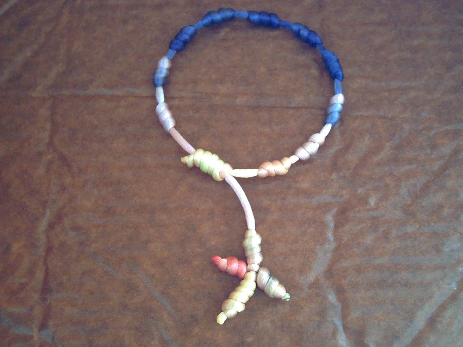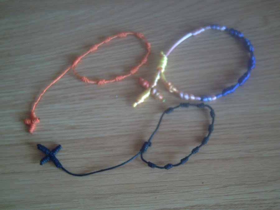El negro está hecho en algodón encerado finito, el naranja en cordón de nylon retorcido, y el otro en cola de ratón en color degradado...y para poder ajustarlos mejor a la muñeca llevan un nudo corredizo.