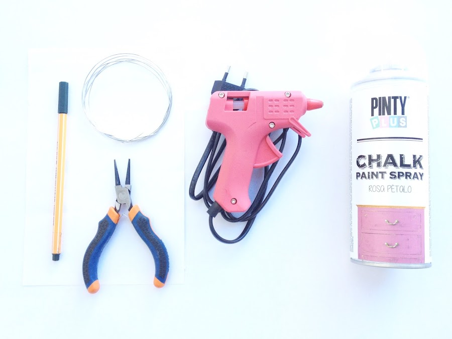 Lo que necesitamos para hacer este diy es: alambre y alicates, pintura en spray, boli o lápiz y papel. La pistola de silicona está en la foto porque pensaba que me haría falta, pero al final no la utilicé.