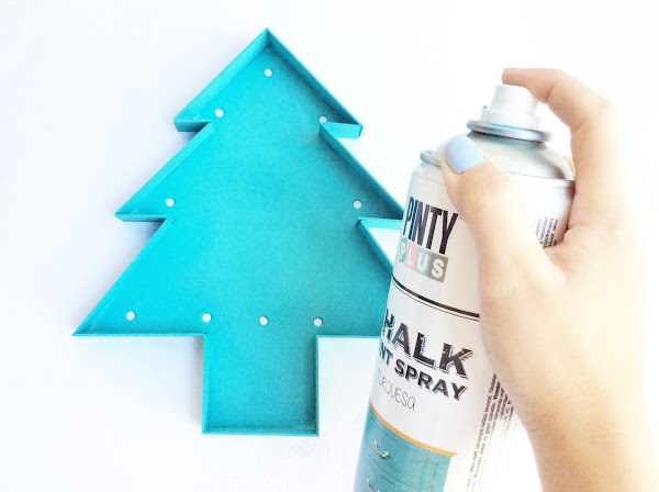 Cuando se haya secado el pegamento, aplica una capa del spray que hayas elegido. Como yo he hecho un arbol, me ha gustado la idea de aplicar el color turquesa chalk paint de Novasol Spray.