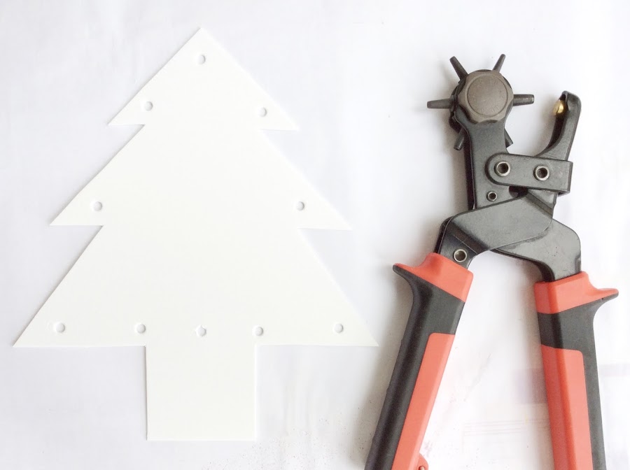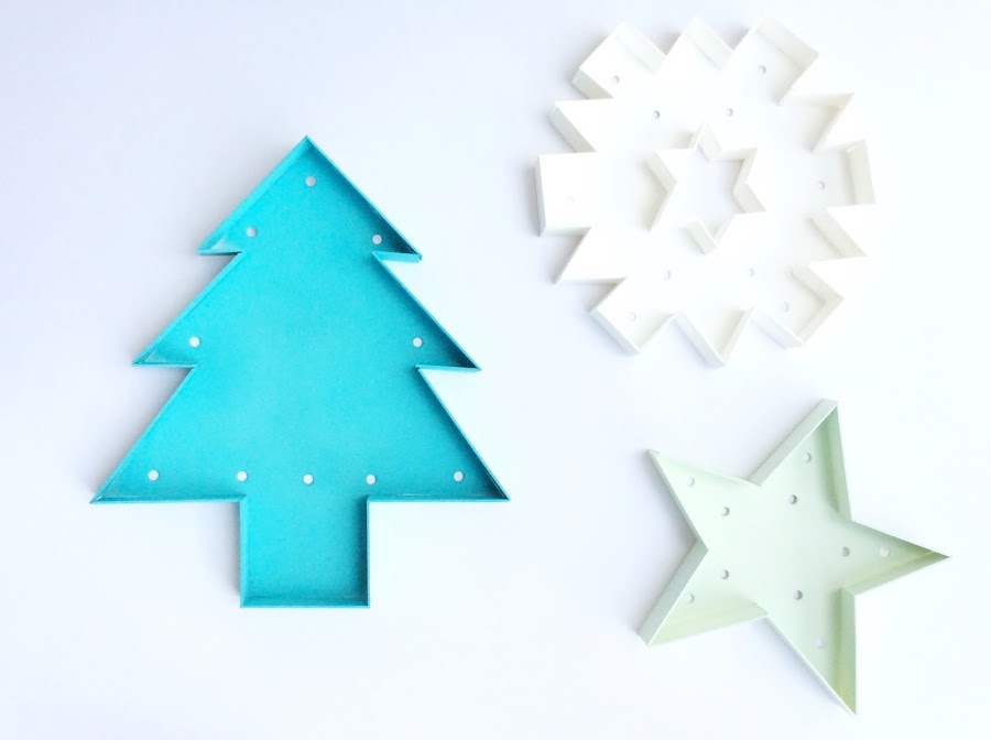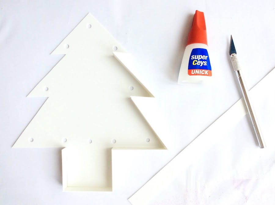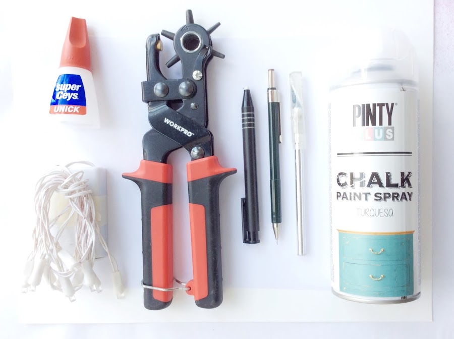 Lo que hace falta para conseguir estas figuritas navideñas tan monas es: una base (la mía es forex blanco, pero seguro que encuentras cartón de forma más fácil, jeje), una guirnalda de luces led, perforadora, pegamento, papel, lápiz, cúter y chalk paint en spray.