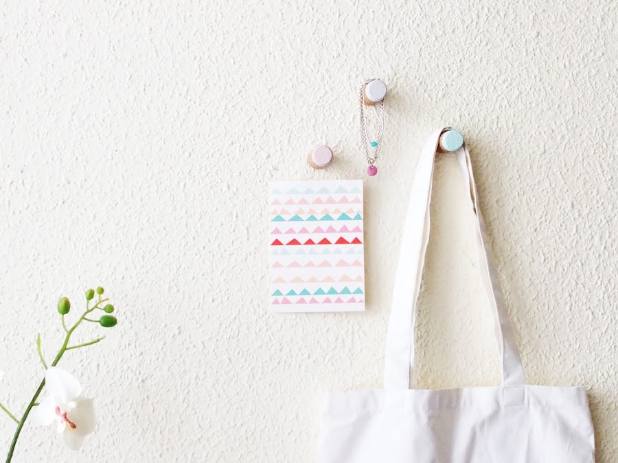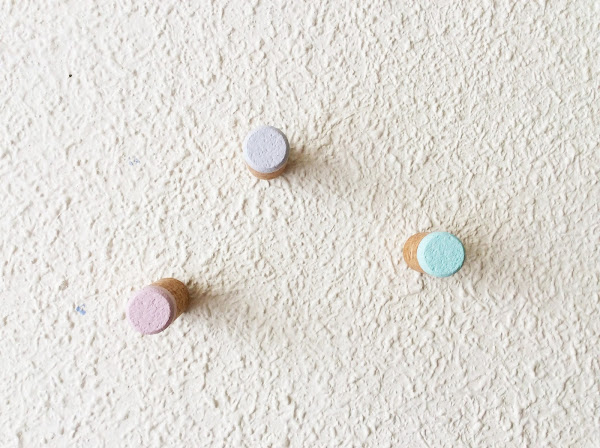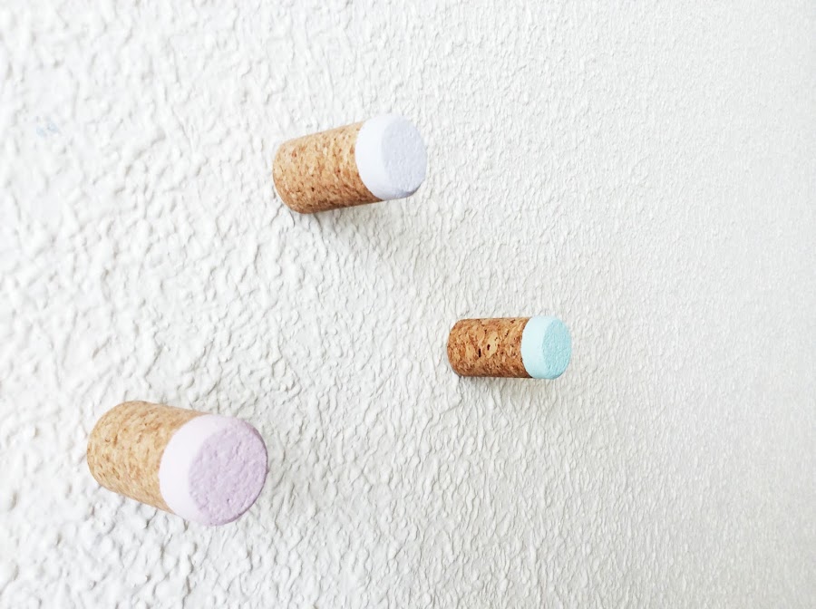 Cuando la pintura se haya secado (unos minutos será suficiente) ya podemos colgar los percheros. Simplemente basta con girar el corcho ejerciendo un poco de fuerza contra la pared. (Si ves que no tienes mucha fuerza o que tu pared se resiste un poco haz un pequeño agujero con un clavo y el martillo).