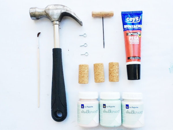 Lo que nos va a hacer falta es: un corcho y un tornillo con cabeza tipo gancho (un pack por cada perchero que queráis poner), una barrena, pegamento Montack de ceys, pincel y pintura chalk paint en diferentes colores (yo he escogido mint, rosa capricho y sal de Ibiza de pinturas La Pajarita)