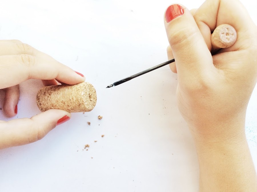 Los pasos a seguir son muy fáciles. Primero hay que hacer es agujerear el corcho, para ello nos ayudaremos de la barrena. Solo hay que vaciar un poco de corcho por el centro.