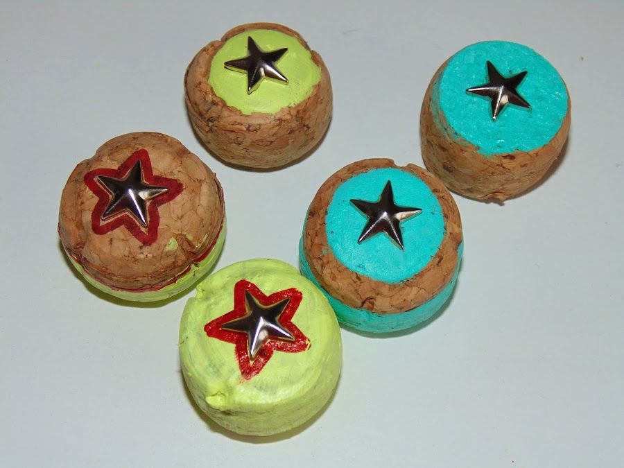 Con la pintura acrílica fue pintando los corchos de diferentes colores y modelos. Cuando la pintura ya estaba seca coloqué una tachuelas en forma de estrella que tenía.