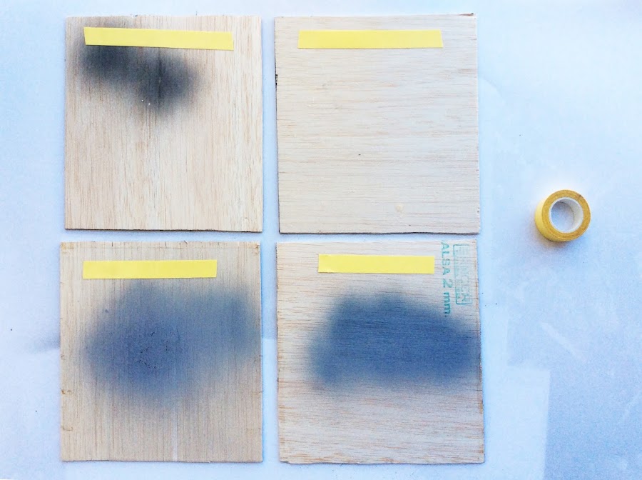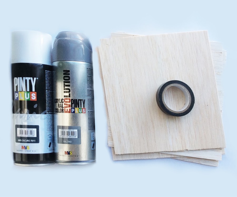Lo que nos va a hacer falta es: cuadrados de madera de balsa (es barata y ligera, perfecta para este diy y se puede conseguir en tiendas de manualidades, ferreterías y grandes almacenes), un poco de washi (también vale cinta de carrocero o similar), cinta de doble cara (pero de la gordita, no la de pegar papel) y pintura en spray de diferentes colores (yo he cogido gris con diferentes tonos y acabados: basic, evolution, aqua y chalk de Novasolspray).