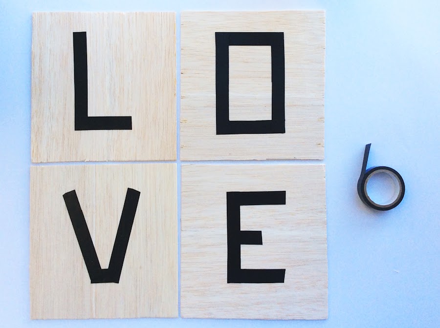 Lo que hay que hacer es “dibujar” con el washi sobre las maderas las diferentes letras que queremos hacer. Lo más fácil es hacer las letras rectas como os enseño yo pero si tenéis ganas y paciencia podéis hacer caligrafías más complejas.