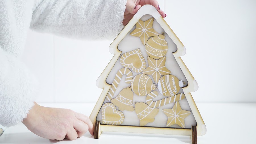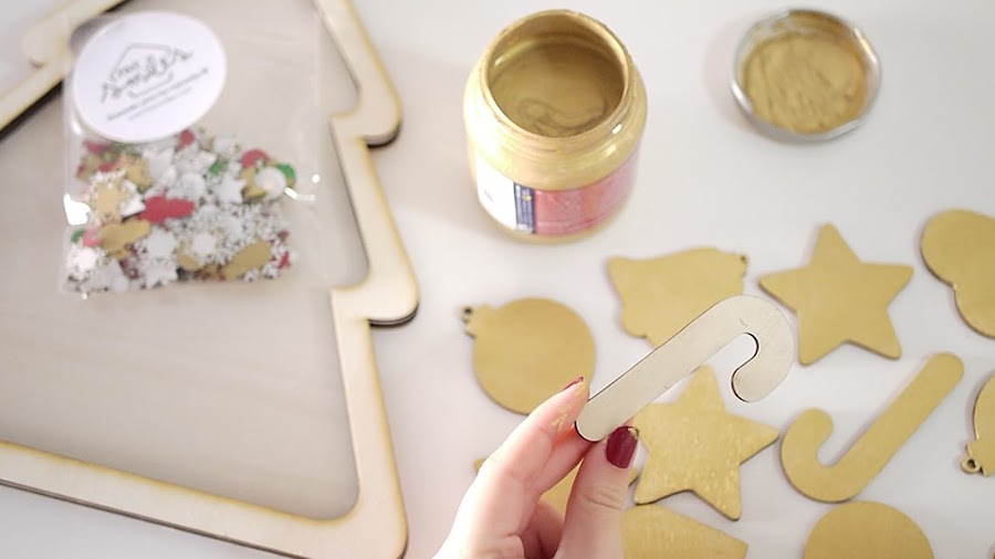 Yo, como buena diyer, he personalizado las piezas pintándolas con una pintura dorado metalizado de La Pajarita y luego he hecho unos dibujos con un rotulador permanente blanco para hacer un efecto de galletitas de jengibre. Os dejo el vídeo con el paso a paso por si os gusta la idea.