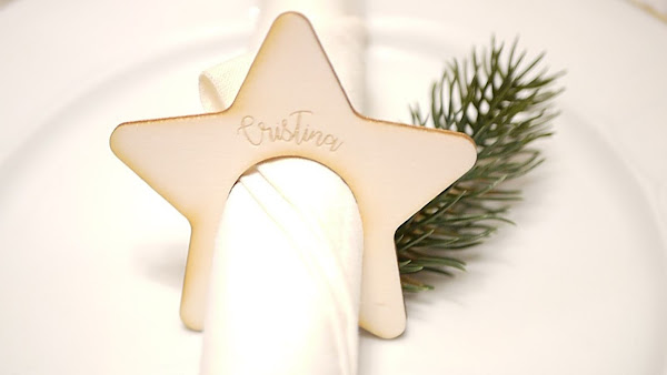Lo de los sittings con el nombre de cada asistente sé que es una cosa que os gusta, ya que los de otros años os han encantado. Así que este año he utilizado unos servilleteros con forma de estrella personalizados con los nombres en láser. Y para rematar la decoración, he añadido una ramita.