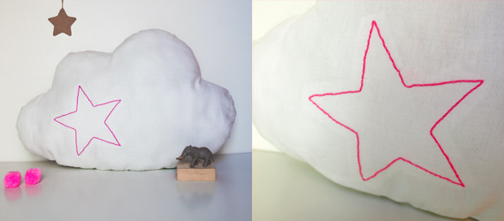 Si os parece demasiado, o preferís el fluo en pequeña dosis aquí os dejo un cojín nube blanco con una estrella bordada en rosa que tenemos en la shop, (auto publi, jejeje)