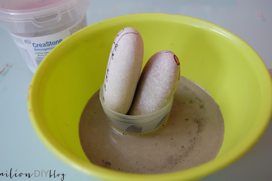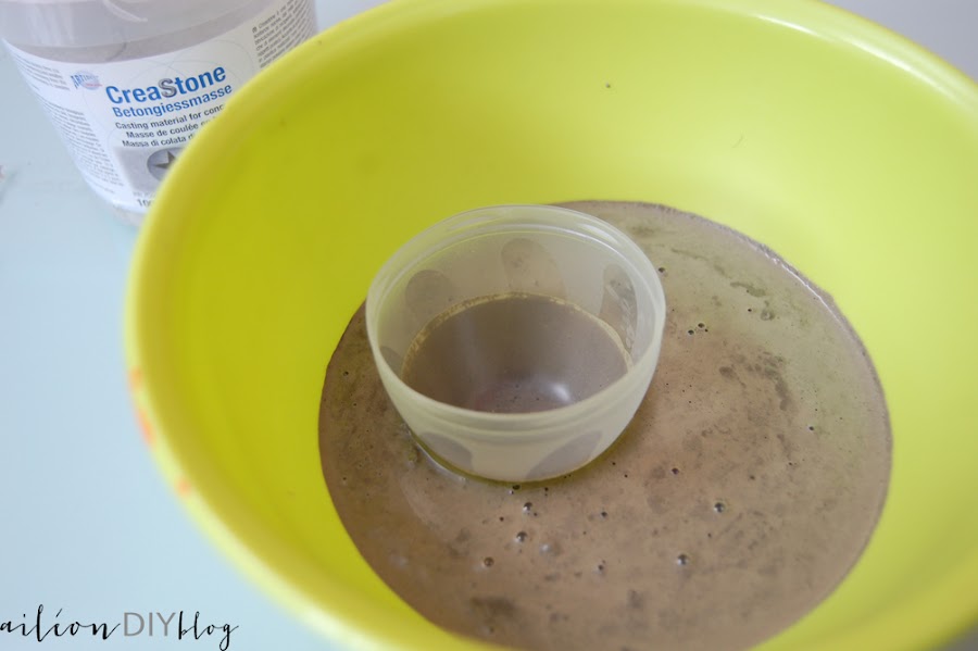 Después solo deberemos introducir el otro cuenquito o tapón (como es mi caso) en la mezcla. Para ayudarnos y que no pueda ser que salga hacia afuera, yo utilicé unas piedras para hacer presión en el liquido del hormigón.