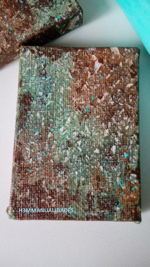 En el caso del marrón salpiqué, una vez seca la pintura marmoleada, con un tono turquesa, que parece que no, pero alegra el pequeño cuadro