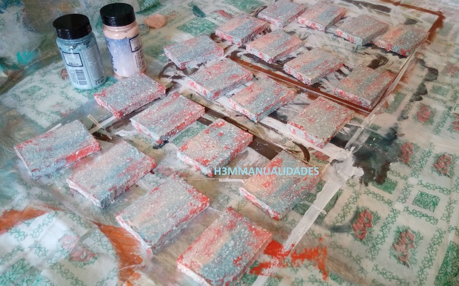 Sobre esa base, y de forma algo aleatoria, apliqué dos tonos de pintura con efecto "marmoleado". Se dan unas pinceladas y lo hecho se extiende con un acetato o similar, de manera que se entremezclan los tonos. No se pueden prever siempre los resultados y hay que dejar lugar a la "sorpresa", pues ninguno queda exactamente igual.