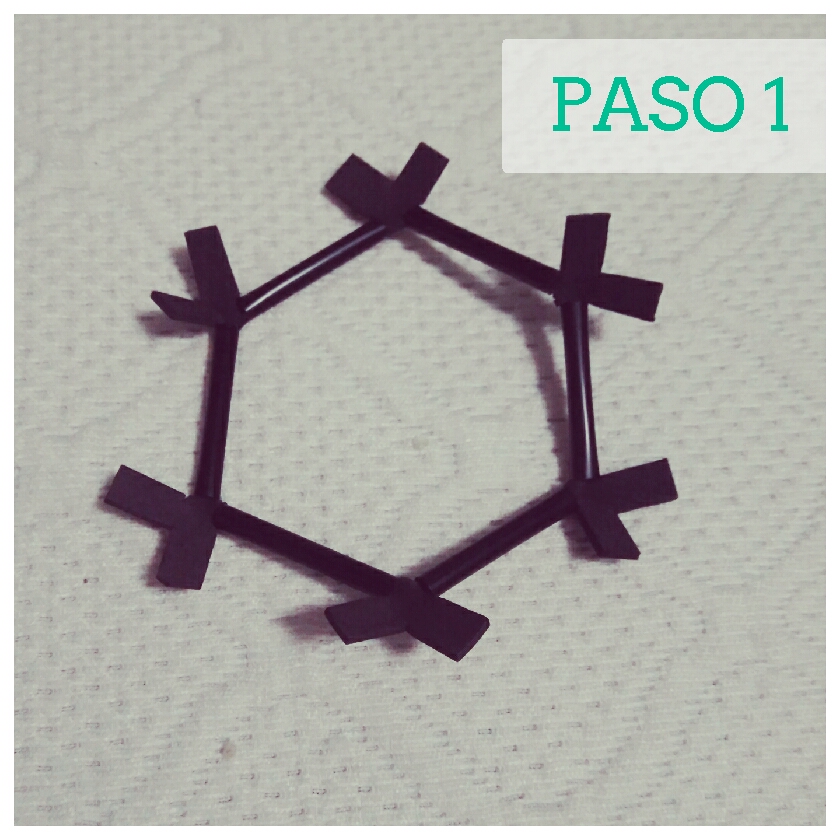 PASO 1.Empieza formando un hexágono con las piezas de 35 y la goma Eva de 4 puntas.