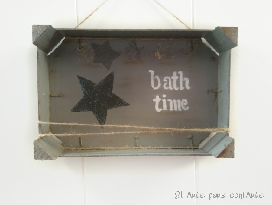 Mientras tanto podemos ir siguiendo con la decoración. Como es para el baño, vamos a ponerle un pequeño texto: "Bath time". Para que resalte y destaque, pìntamos las letras en blanco, que contrasta con el fondo oscuro y le da luminosidad.