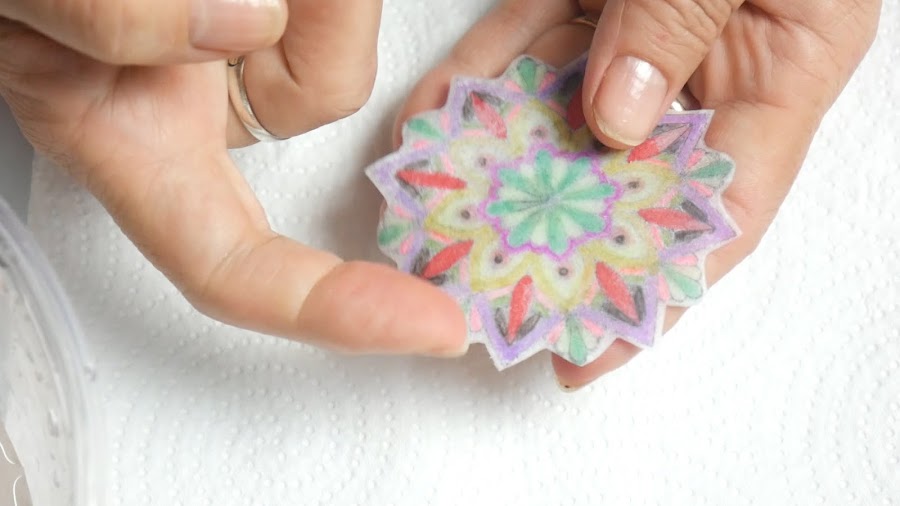A continuación sumergimos en dibujo plastificado y cortado en un poco de agua y lo dejamos 1 minuto aproximadamente, lo sacamos, lo apoyamos en una bandeja de las de comida no en un plato ya que se pegaría la silicona en la base y con cuidado deslizamos sobre el revés, o sea sobre el papel mojado la yema de los dedos y se van desprendiendo los trocitos de papel, principalmente en los bordes.
