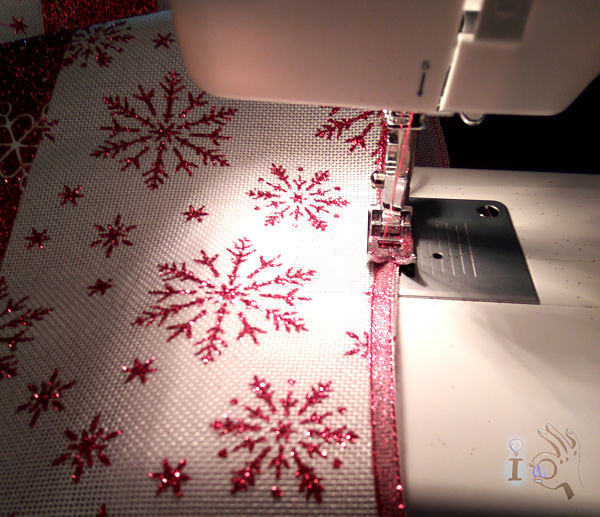 Se cose la cinta por los dos lados largos del camino de mesa y luego por los dos lados cortos, también usando punto zigzag, porque sujeta bien y si se ve queda bonito.