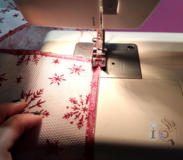 A partir de ahí poco más. Simplemente medir el largo de la mesa y darle un poco más para que cuelgue por los lados, y cortamos dos trozos de esa medida de la arpillera blanca y un trozo de la cinta gruesa roja. Y luego yo los cosí con la máquina de coser con punto zig-zag. Usé la máquina porque mi mesa es bastante larga y es más rápido que hacerlo a mano, pero si no queréis coger la aguja y no tenéis máquina también podéis hacerlo con pegamento textil o incluso un buen pegamento no textil, porque al ser arpillera y la otra cinta no tiene tampoco mucha textura de tela....