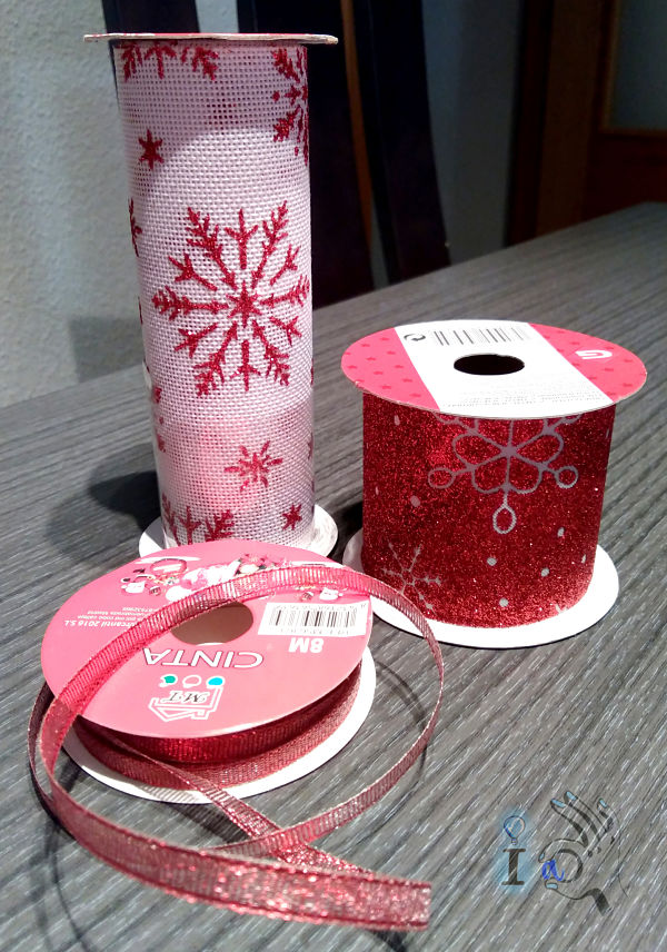 Se trata de una cinta de arpillera blanca con los copos de nieve en purpurina roja, una cinta roja brillante con los copos de nieve en blanco y para rematar los bordes compré esta cintita fina roja brillante.